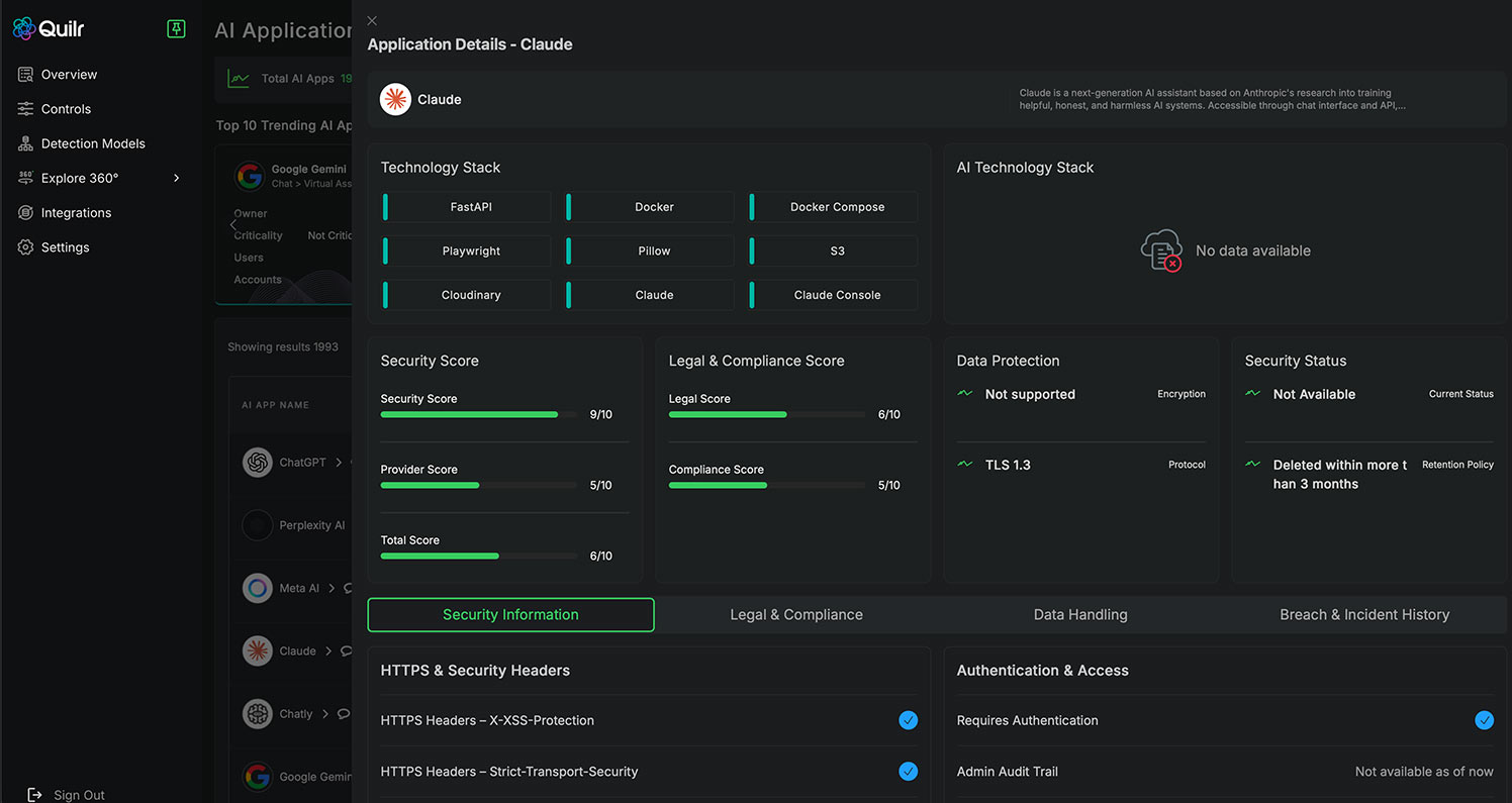 Quilr continuously scans for unsanctioned AI apps, embedded assistants, and code copilots. Gain full visibility into your organization’s AI footprint and prevent unapproved tools from handling sensitive data.