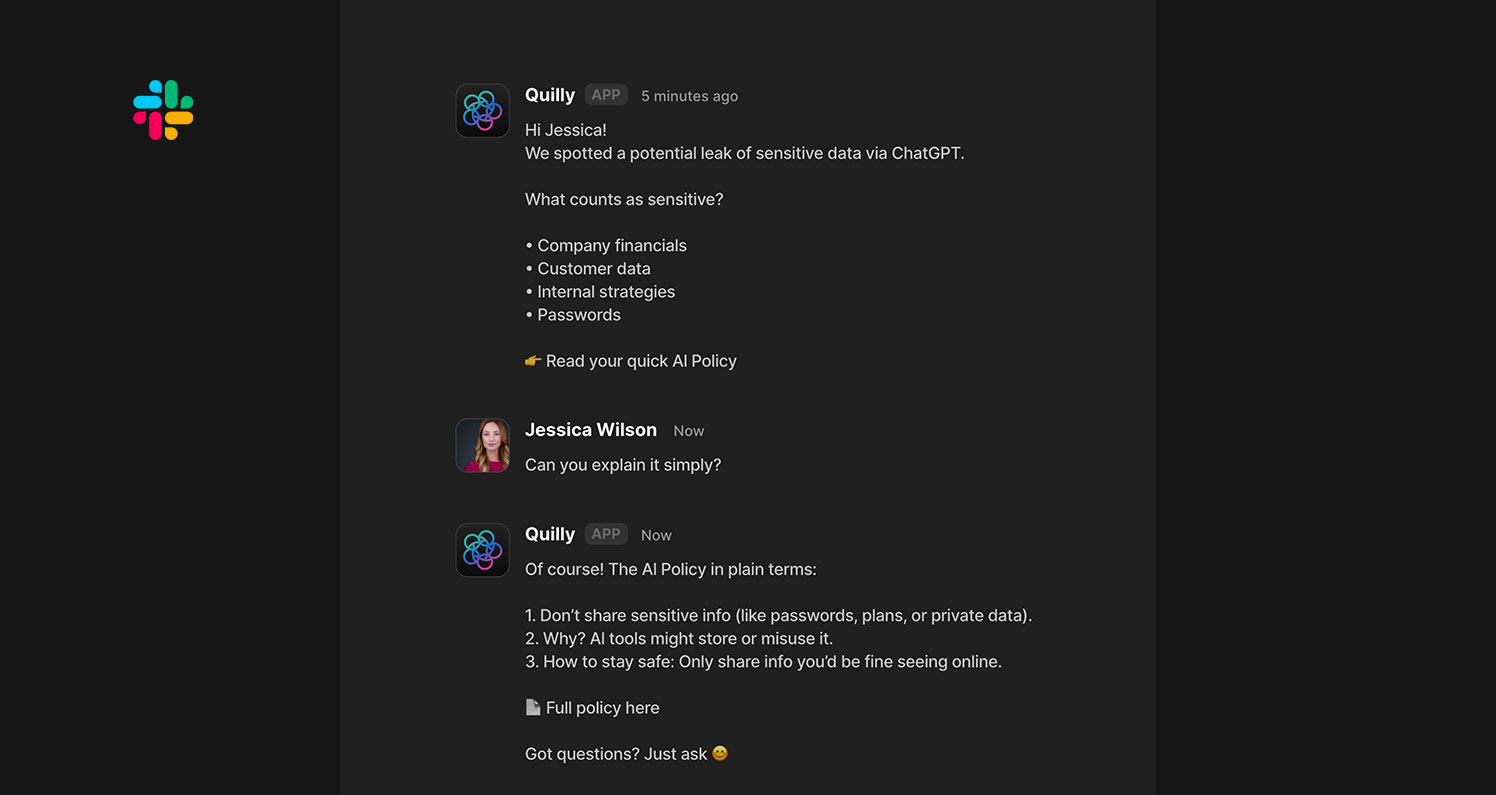 Quilly is your team’s personal AI buddy for security. It explains why an action is risky, suggests safer alternatives, and lets employees resolve issues themselves — no more confusing alerts or dead-end blocks.