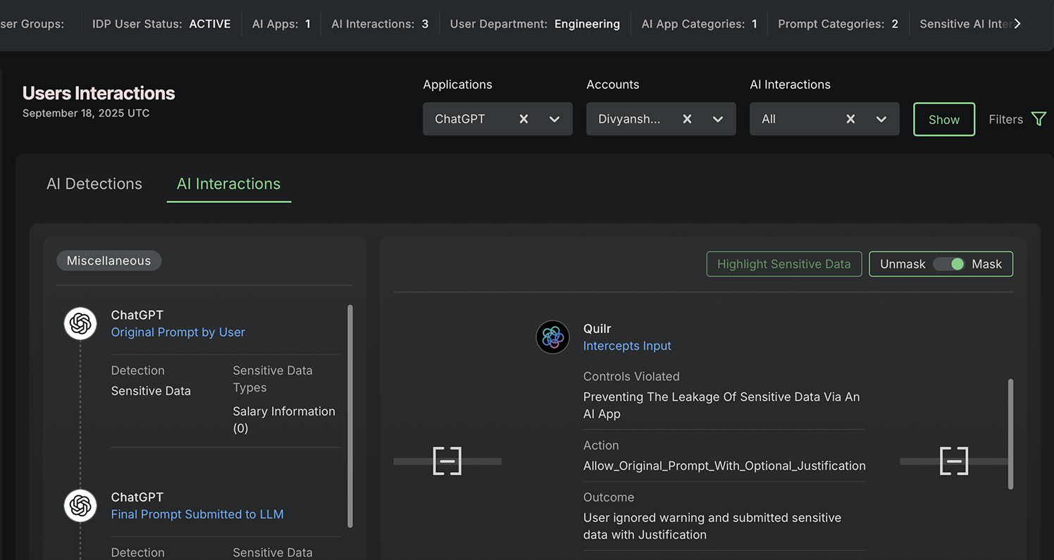 Quilr engages users directly, helping them remediate incidents upstream. From revoking a risky SaaS share to correcting an unsafe AI prompt, employees can fix issues instantly, reducing analyst workload.