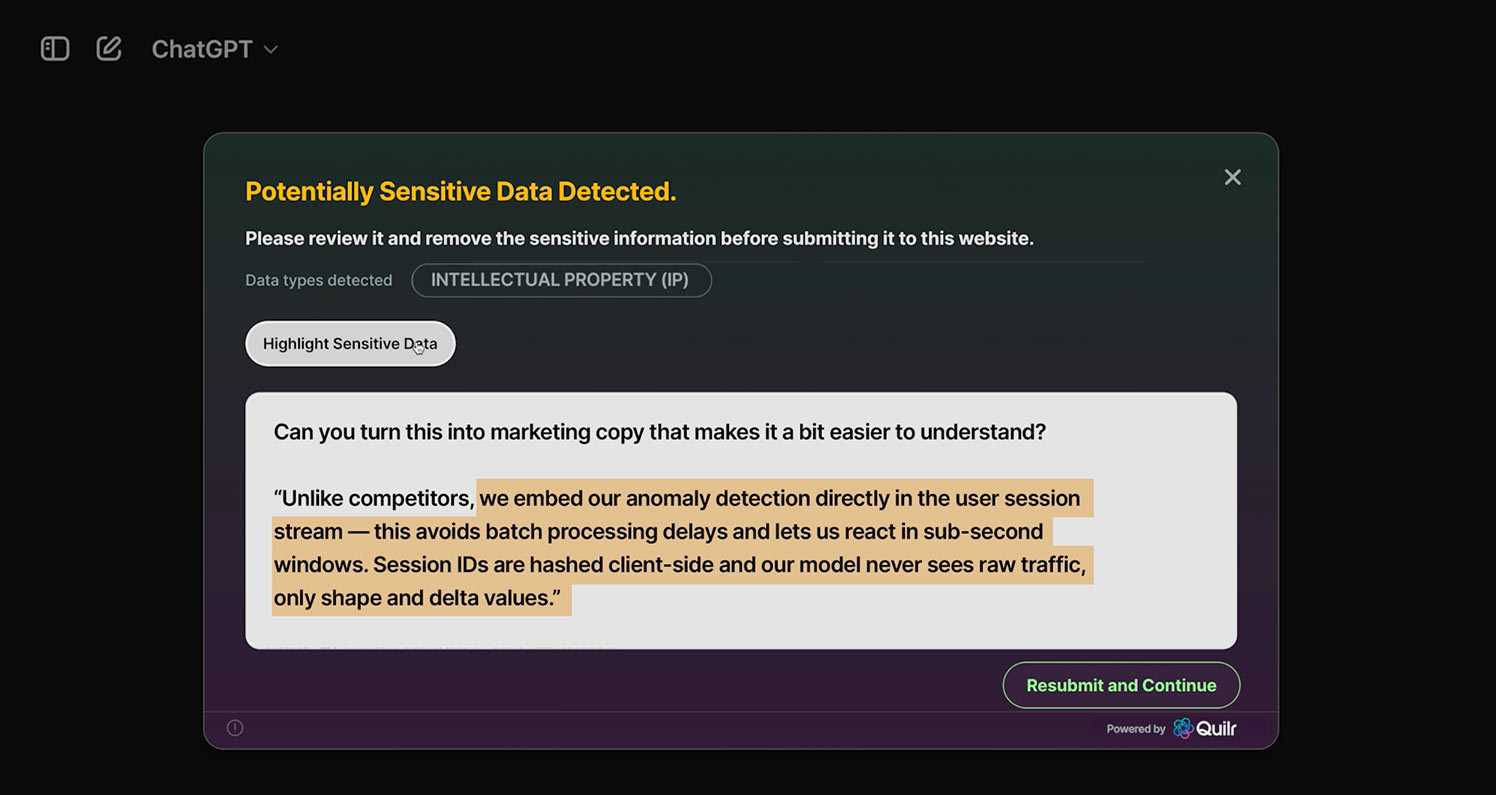 Quilr’s agentic AI guardrails understand content, context, and intent. That means legitimate workflows continue without interruption, while true risks are blocked instantly — reducing false positives by up to 90%.